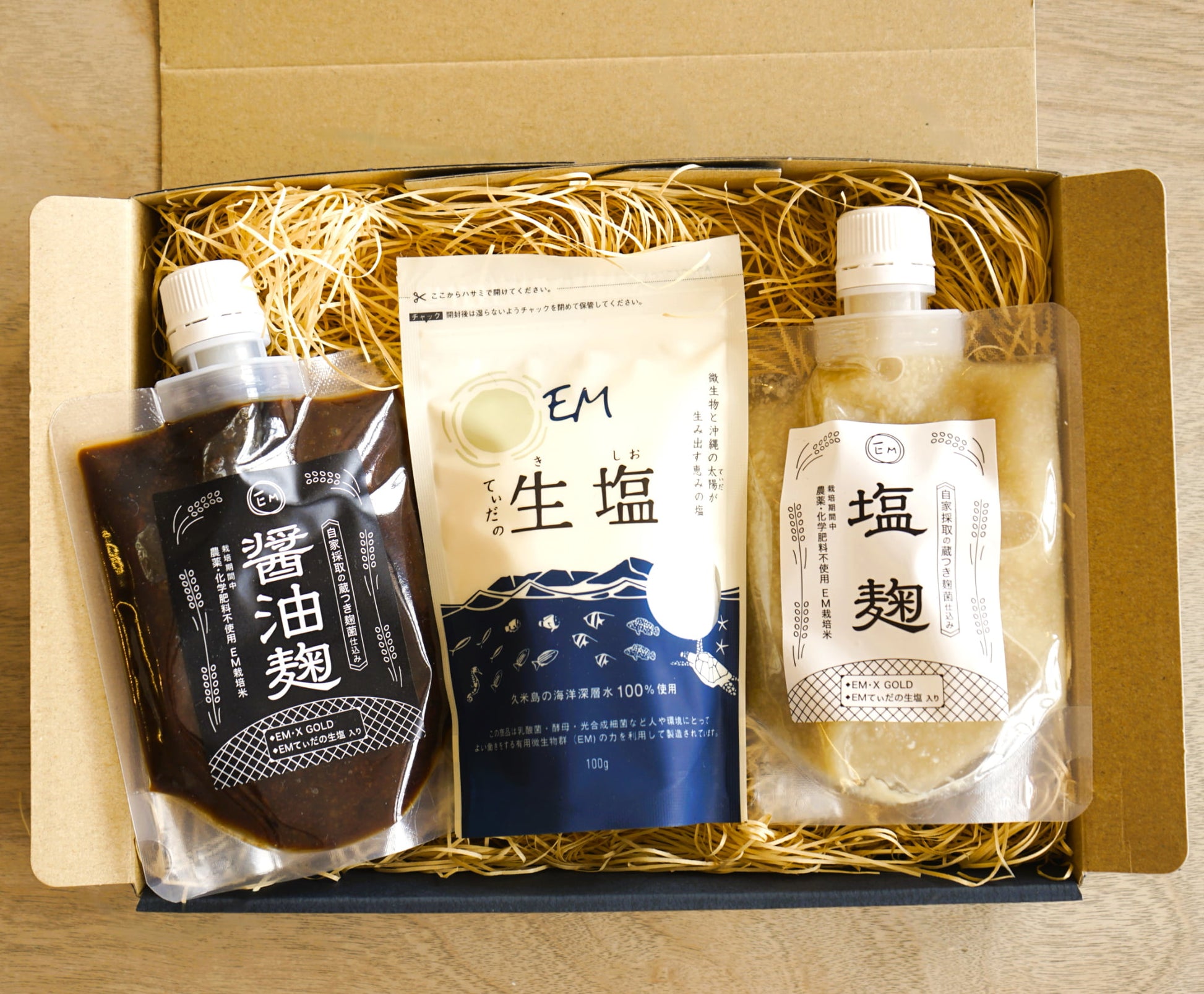 塩麴、醤油麹はEM・X GOLD、てぃだの生塩を使用し自然に任せた発酵で、うま味を引き出しています。